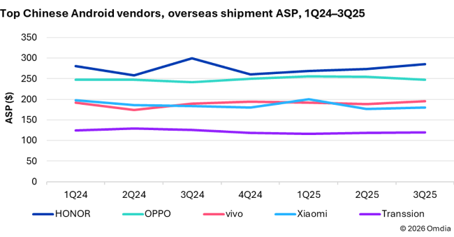 - Mentre molti vendor cinesi restano fortemente concentrati sulla fascia entry-level, HONOR ha dato priorità al segmento di prezzo 300/499 dollari, che ha rappresentato circa il 23% delle sue spedizioni all’estero nei primi tre trimestri del 2025: la quota più alta tra i principali vendor cinesi. Questo posizionamento richiede maggiore disciplina nel branding, nell’esecuzione sui canali e nella differenziazione di prodotto.